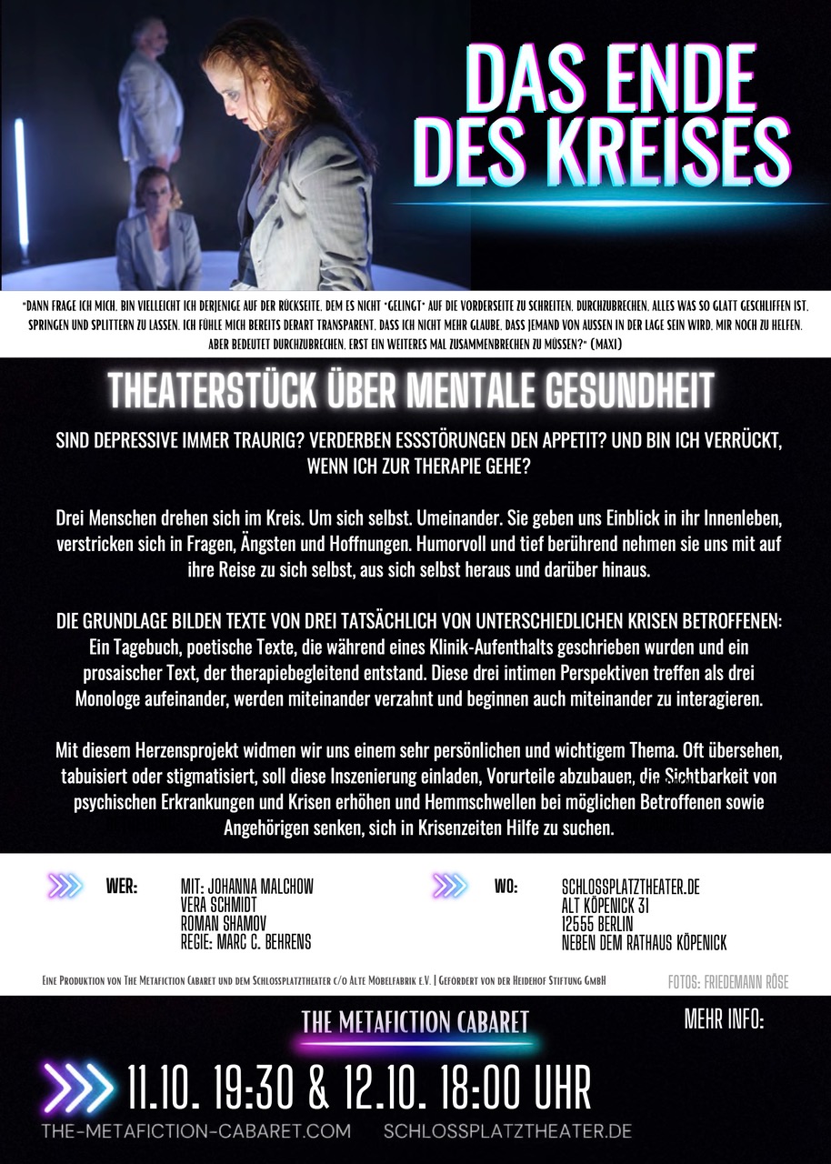 „Das Ende des Kreises“ ist eine Produktion von The Metafiction Cabaret und dem Schlossplatztheater c/o Alte Möbelfabrik e.V., gefördert von der Heidehof Stiftung GmbH.