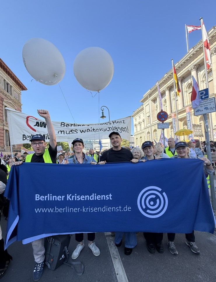 Gemeinsam mit vielen anderen Organisationen, Verbänden und Trägern haben Mitarbeitende des Berliner Krisendienst bei der Protestkundgebung vor dem Abgeordnetenhaus am 11.09.25 gegen die geplanten Kürzungen im sozialen Bereich demonstriert. Die Sorge ist groß, dass die vom Berliner Senat für den nächsten Doppelhaushalt angekündigten Kürzungen das soziale Netz unserer Stadt massiv beschädigen würden, sollten sie zur Umsetzung kommen.